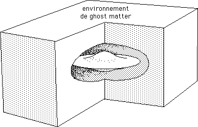 ...Tout se passe, pour la matière ordinaire "comme si la matière attirait les photons" et pour la ghost matter" comme si elle repoussait les photons". Une cavité ménagée dans la ghost matter aurait dont un effet focalisant, comme évoqué ci-après :