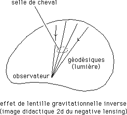 ... Dans le modèle, et dans notre feuillet d'espace-temps, des conglomérats de ghost matter (ou "matière gémellaire), présents dans la portions "adjacente" F* de notre feuillet F, créent une "courbure induite" négative dans celui-ci. C'est ce qu'on a tenté d'évoquer, didactiquement, plus haut, en utilisant lemodèle d'un "négacône émoussé", dont la partie centrale est en selle de cheval (une surface à densioté de courbure, négative, constante). Si on considère la figure ci-dessus, on a suggéré la présence d'un conglomérat de matière gémellaire, ou ghost matter, par un pointillé. Celui-ci n'est pas optiquement observable à partir de notre espace-temps (puisque, géométriquement, les photons ne peuvent pas passer d'un feuillet à l'autre). Par contre, comme suggéré sur la figure, ces conglomérats produisent un effet de lentille gravitationnelle négatif (negative lensing effect).Les trajectoires les photons, dans le feuillet F, sont schématiquement représentées. Mais ces photons ne peuvent interagir avec les atomes de ghost matter qui constituent le conglomérat présent dans la portion adjacente du feuillet F (dont le pourtour est représenté en pointillé). Ces photons "traversent donc librement le conglomérat".