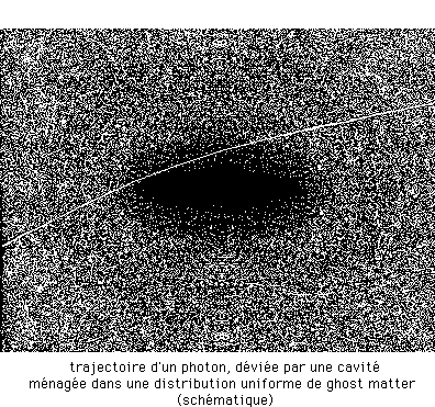 ...L'indication n'est que schématique, mais, rassurez-vous : personne ne sait calculer le trajet d'un rayon lumineux dans une distribution inhomogène de matière (ou de ghost matter).