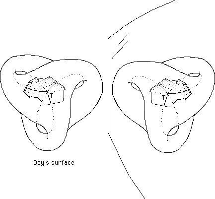 ...This is the surface invented by Werner Boy, a student of Hilberth. Attention will be paid to this interesting object in the section of the site devoted to mathematics. We have removed a portion of the surface in order to show the triple point T.