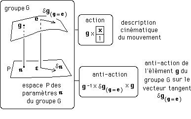 Souriau a donc cherché à construire une seconde action de groupe, celle du groupe sur son espace des moments . Mais cette action, dite action coadjointe ou essentielle , ne pouvait pas émerger directement. Il lui a fallu alors passer par cet intermédiaire qu'est ce que j'appelle "l'anti-action du groupe sur son vecteur tangent".