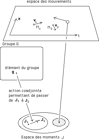 Il existe donc une action de groupe qui permet de passer d'une de ces mouvements M1 à un mouvement M2. C'est une action coadjointe, "pilotée" par le groupe.
