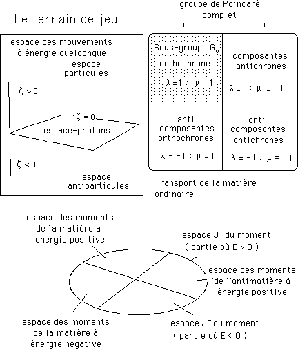 Cette partie grisée s'identifie avec la sous-groupe orthochrone du groupe de Poincaré étendu. En bas, dans les secteurs, on a figure un mouvement d'une particule de matière. Ces éléments du sous-groupe conduisent à d'autres mouvements, qui correspondent également à de la matière.