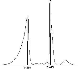 ...Deux pics significatifs apparaissent pour les valeurs 0,615 et 0,380 en coincidence précise avec les pics de la figure 1 (w = 0,618 et w2 = 0,380). Souriau superpose alors ce spectre avec la fonction q :
