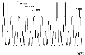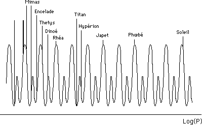 ...La transformé de Fourier inverse, en filtrant avec ces deux raies, redonne une suite de périodes probables pour les satellites. Certains sont "bien placés", d'autre "moins bien" on retrouve un phénomène analogue à celui qui affecte les orbites du couple résonant Neptune- Pluton, qui sont en train de "s'expliquer", aux confins du système solaire.