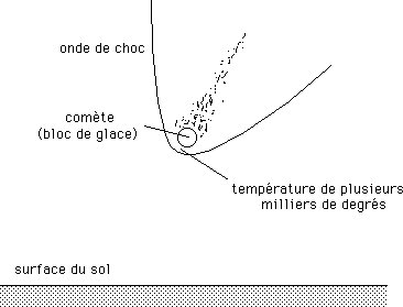 ...Quand on parle de comète, on évoque parfois le mot "neige sale". Rien ne dit en effet que cette eau gelée, cristallisée, ait pu se constituer en glace dure, comme cela serait le cas si elle était soumise à des forces de pression. Dans une comète, objet de petite taille, les forces cohésive, de gravitation, sont très faibles. Ainsi, ce qui arriverait sur Terre serait peut être .... une boule de neige, de la taille d'une montagne, animée d'une vitesse de chute de plusieurs dizaines de kilomètres par seconde. Cela n'empécherait nullement une onde de choc très intense de se former, synonyme de fort réchauffement de l'air, dans la phase incident et surtout après réflexion, quand toute l'énergie cinétique se trouve transformée en chaleur. L'objet en lui même n'a pas de consistance, mais ce qui est dommageable, c'est son énergie, synonyme de surpression et de choc thermique. En attaquant l'atmosphère dense il crée son onde de choc. Si l'impact avec l'air est assez violent, la prise de contact de la comète avec l'atmosphère est équivalente à une explosion. Après les ravages causés à la Toungskaïa par cette onde de choc, ce qui se suivit pouvait peut être être comparé à une pluie de grêlons.