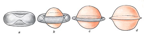 On peut alors être tenté d'essayer de retourner le beignet, la sphère, en poursuivant l'opération. Mais alors un bourrelet va se former, qui va dégénérer selon un vilain pli, ou plus exacterment une surface de rebroussement (figure d). .