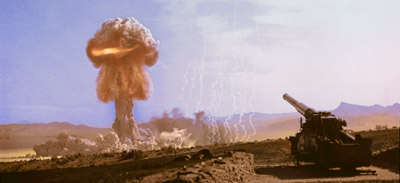 **Canon atomique tirant un obus de 15 kilotonnes ( Hiroshima : 12 kilotonnes ) à 27 km. Désert du Nevada. **