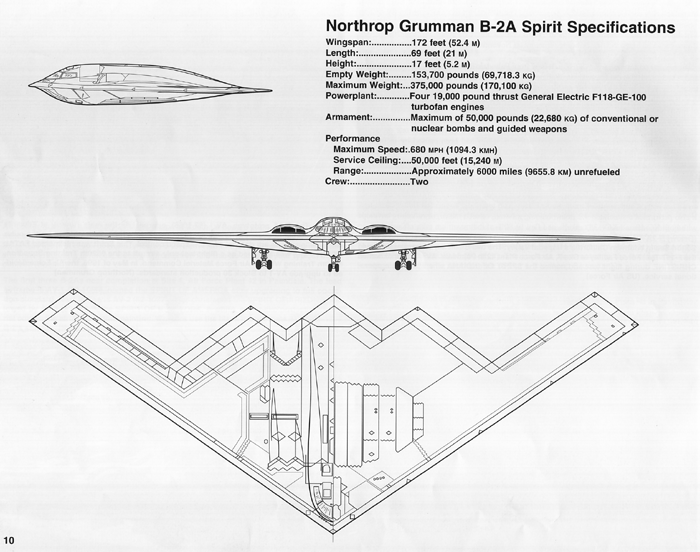 我们不禁要问,他所指的“其他飞机”究竟是哪一种?以下是B-2的三视图及技术参数。