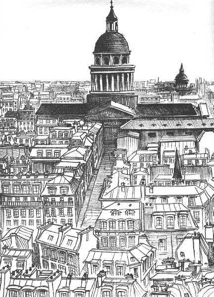 左侧:圣热内维耶夫教堂、先贤祠、索邦大学、圣塞维兰教堂、胡什特街。背景为圣苏比斯教堂、埃菲尔铁塔、瓦雷里安山。前景右侧是巴黎警察局和圣礼拜堂。背景右侧是玛德琳教堂与星形广场凯旋门。