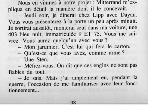 他当时讲述,大约在午夜半时,他从圣日耳曼大道的利普酒馆出来,正准备驾车(一辆蓝色的雪铁龙404 (*))返回位于卢森堡花园旁古耶内尔街4号的住所时,一辆雷诺达芬妮轿车尾随了他。由于当时正值阿尔及利亚战争期间,暗杀事件频发,他感到不安,于是改变了行车路线。当他抵达参议院前时,本应右转驶向住所,但他却左转驶入圣米歇尔大道。然而,那辆可疑的车仍紧随其后。最终,他右转进入奥古斯特-孔德街,弃车跳过天文台花园的篱笆,刚好躲过了一轮机枪扫射——袭击者向他的车连开了七枪。