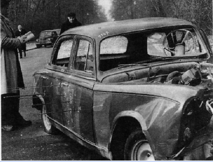 我的备注:金属杆用于标记弹孔和子弹轨迹,位置在驾驶员座位处,共六处。斯登冲锋枪弹匣容量为20发,若假设袭击者将子弹全部打光,这可以解释车窗玻璃的碎裂。由于密特朗声称自己已跳车,车辆可能在撞击中撞坏了某物,因此车身出现损坏。但正如向我发送这张照片的伯纳德·D所指出的,为何方向盘在撞击时完全扭曲,而驾驶员却应是在撞击前就已离开车辆?以下是佩斯凯特著作中的摘录: